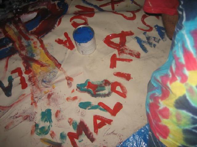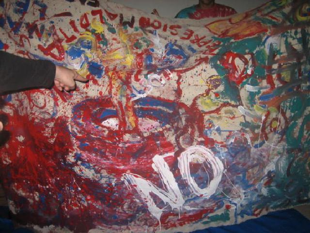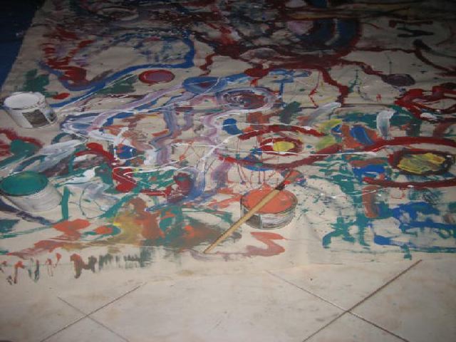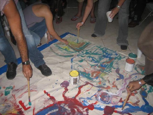 Para rematar la velada se colocó en el suelo un lienzo de proporciones colosales y se pusieron pinturas de diversos colores a disposición del público, para que éstos liberaran su nervio artístico a través del pincel. La intervención de dicho lienzo la lideraron los destacados creadores dominicanos Limber Vilorio, Gerard Ellis y Luis Reyes Guzmán, quienes vieron inmediatamente su efecto multiplicado sobre el resto de la audiencia. El resultado de este experimento estético fue un collage de deseos, frustraciones, angustias, pax, amor y libertad.